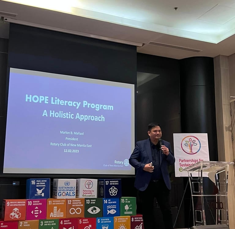 Mr. Marlon Mañaol, President of the Rotary Club of New Manila East, played a pivotal role at the 2023 PSE Learning Poverty Forum, emphasizing the club's commitment to tackling learning poverty through its HOPE Literacy Program. The event, themed "Bridging the Gap: From Learning Poverty to Joyful Learning," brought together leaders from various sectors to address the critical issue of learning poverty, which has significantly worsened due to the COVID-19 pandemic.
